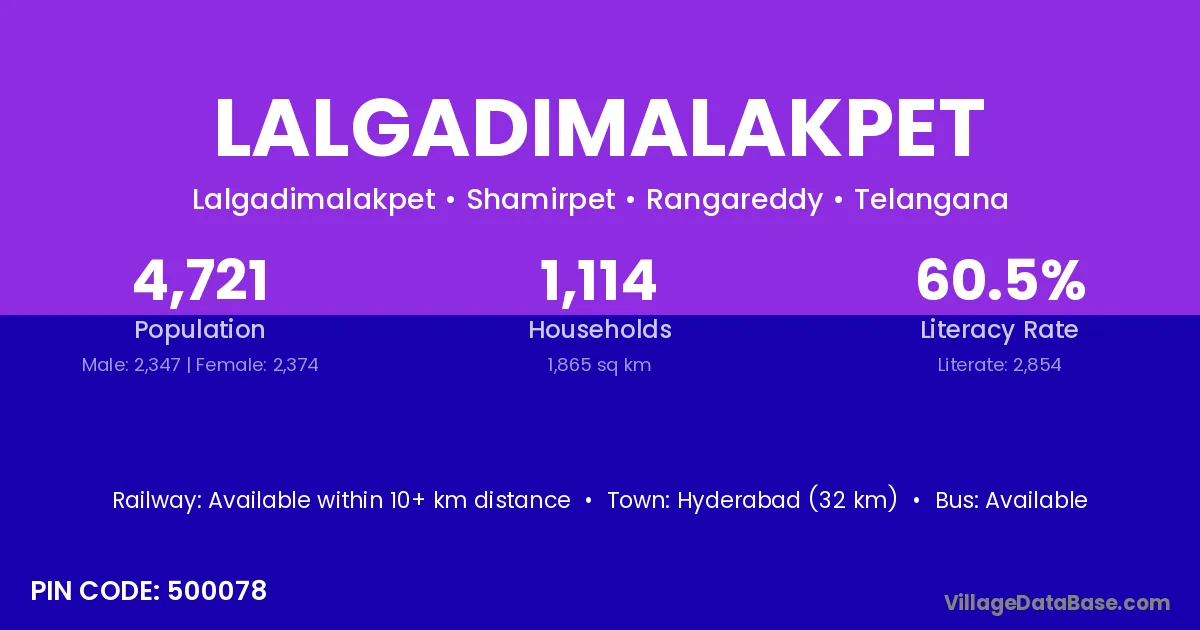 Hyderabad (32 km) is the nearest town to Lalgadimalakpet village for major economic activities and is located approximately 32 km away.