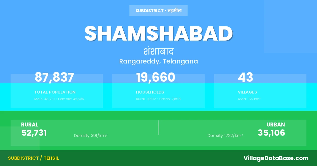 According to the 2011 census The total area of Shamshabad Mandal is 155 km², with a population of 87837 people. The population density is 566 inhabitants per square kilometre, and there are approximately 19660 houses in the sub district.