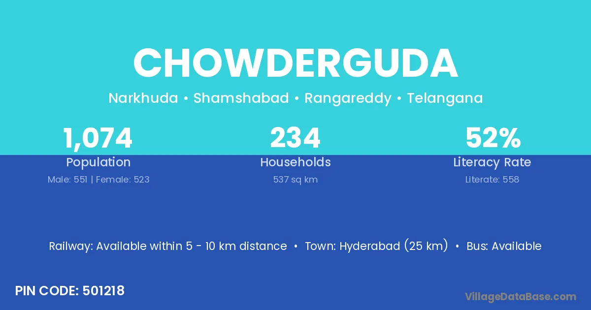 Chowderguda village has a total population of 1,074 people, of which 551 are males and 523 are females.