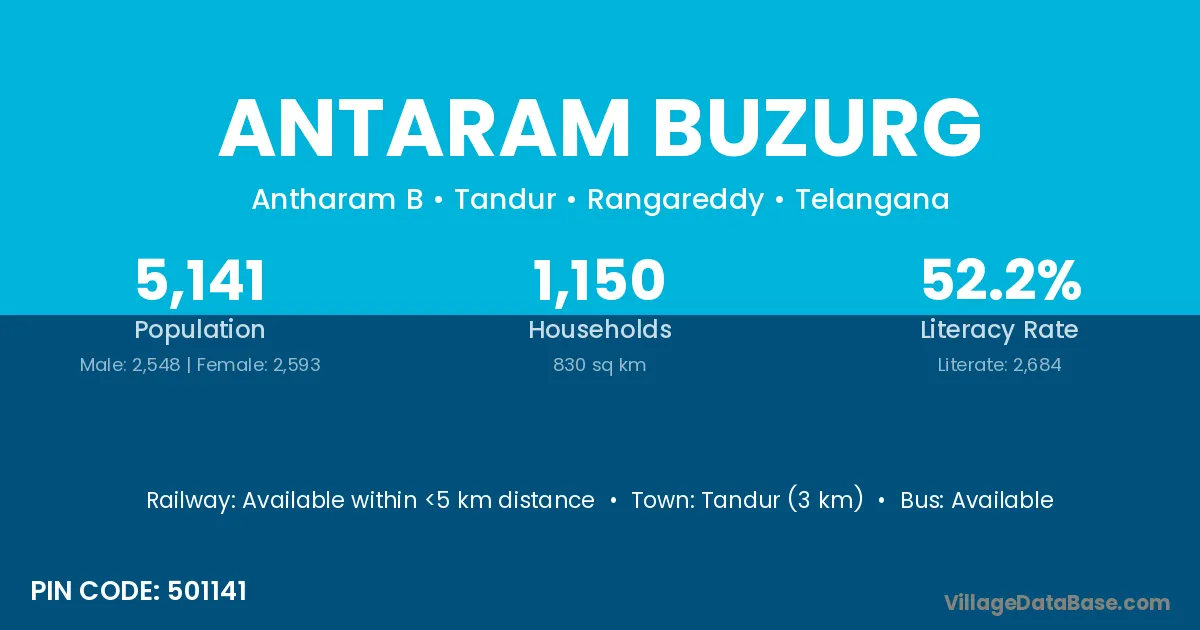Tandur (3 km) is the nearest town to Antaram Buzurg village for major economic activities and is located approximately 3 km away.