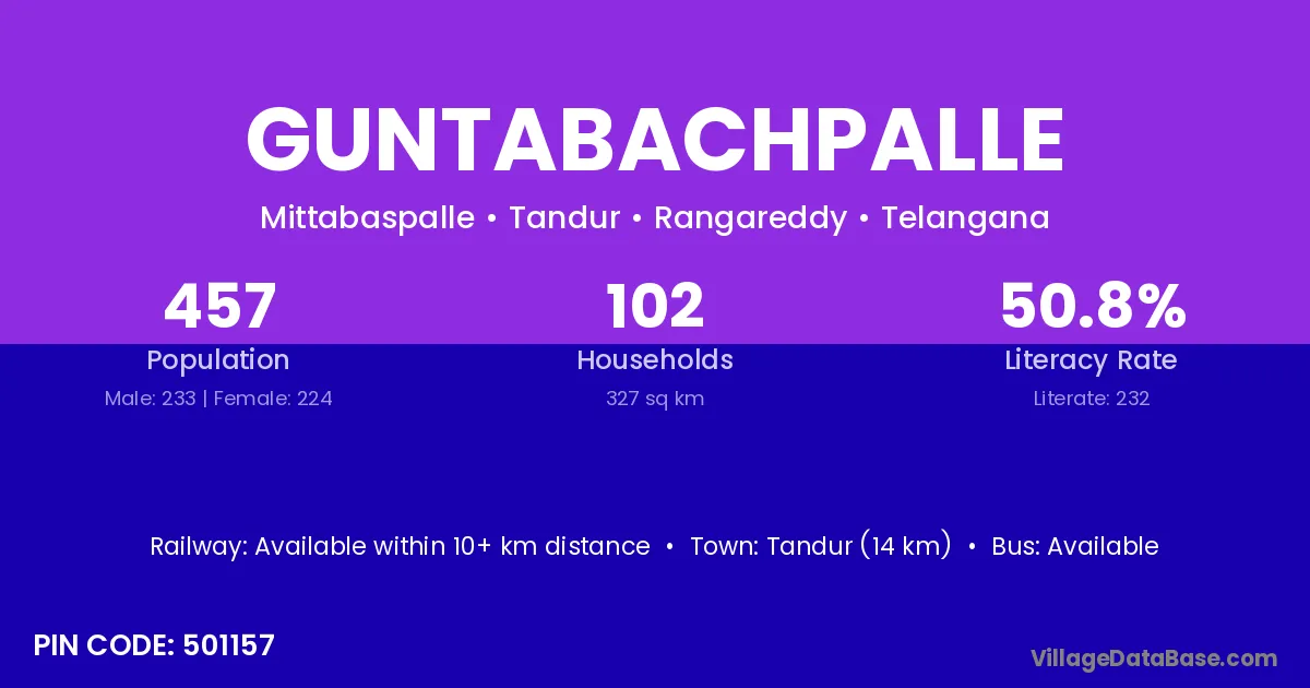Guntabachpalle village has a total population of 457 people, of which 233 are males and 224 are females.