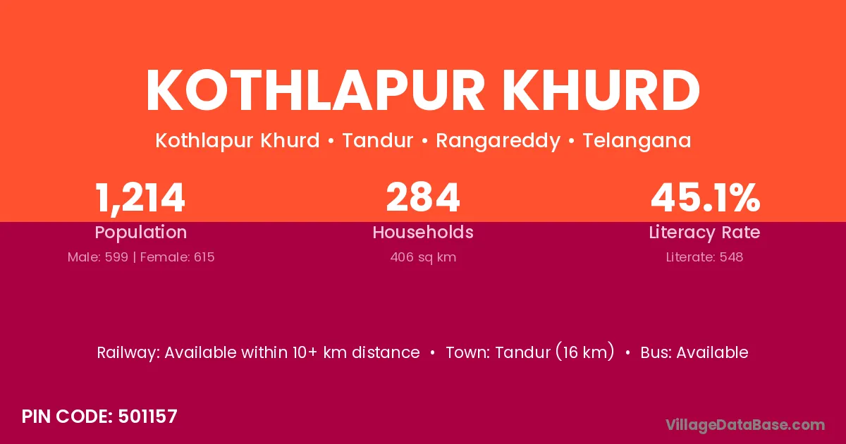 Tandur (16 km) is the nearest town to Kothlapur Khurd village for major economic activities and is located approximately 16 km away.