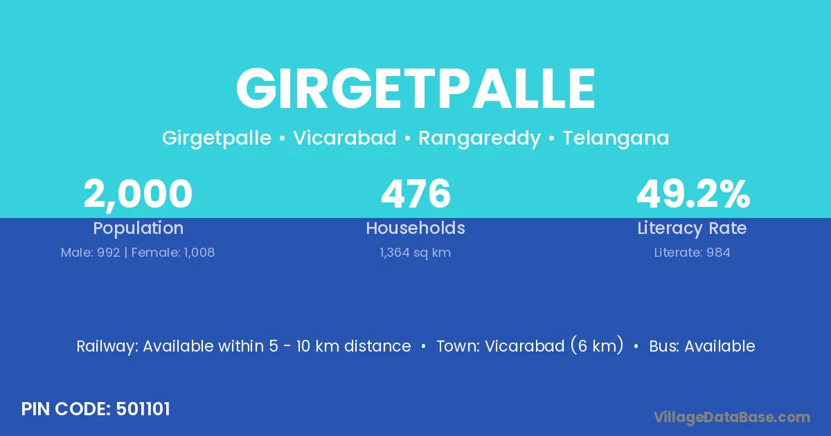 Vicarabad (6 km) is the nearest town to Girgetpalle village for major economic activities and is located approximately 6 km away.