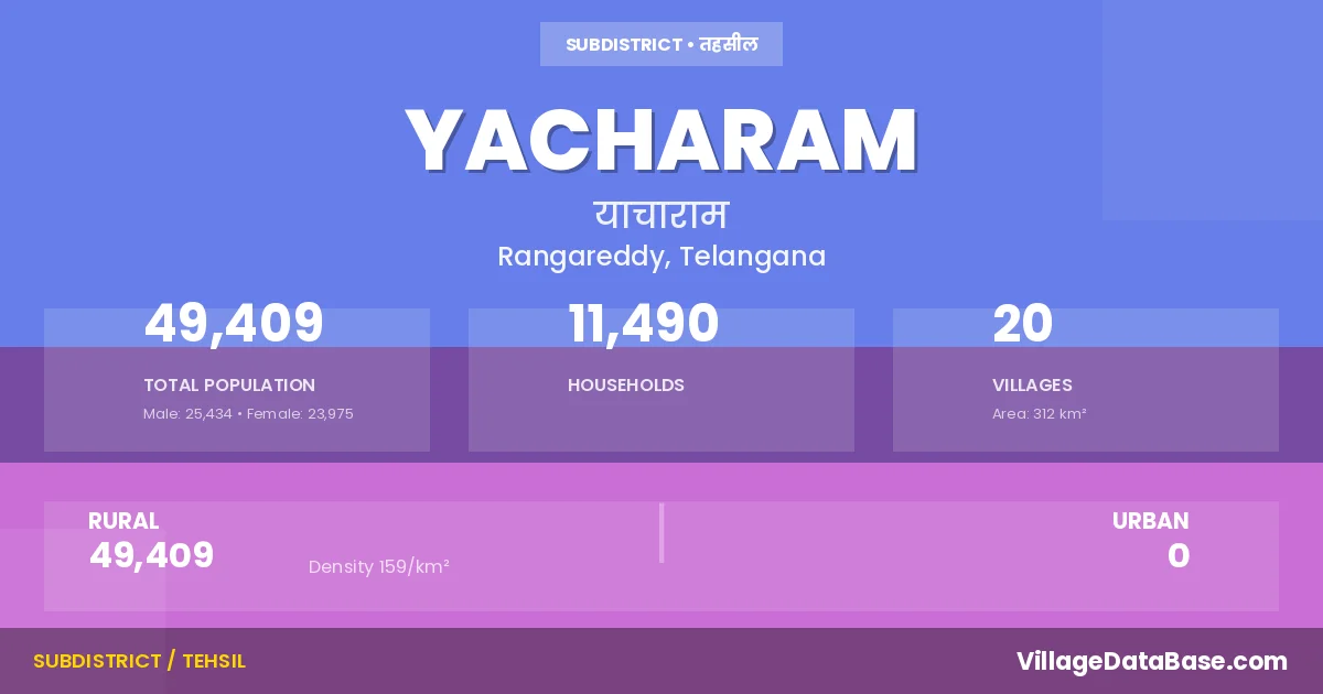 According to the 2011 census The total area of Yacharam Mandal is 312 km², with a population of 49409 people. The population density is 159 inhabitants per square kilometre, and there are approximately 11490 houses in the sub district.
