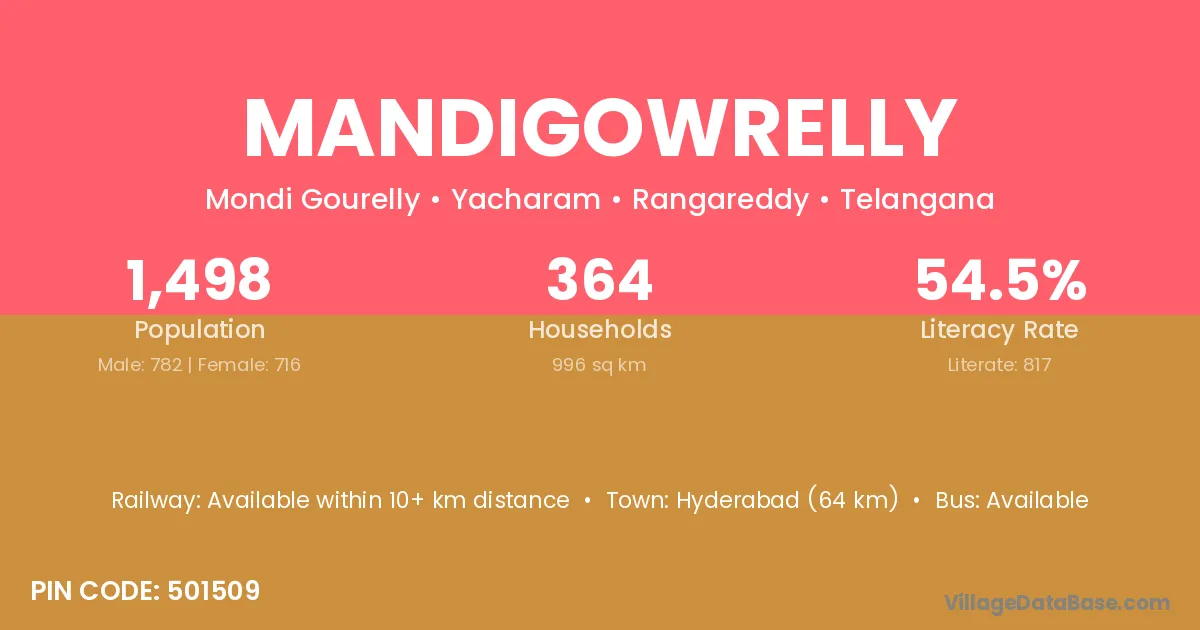 Hyderabad (64 km) is the nearest town to Mandigowrelly village for major economic activities and is located approximately 64 km away.