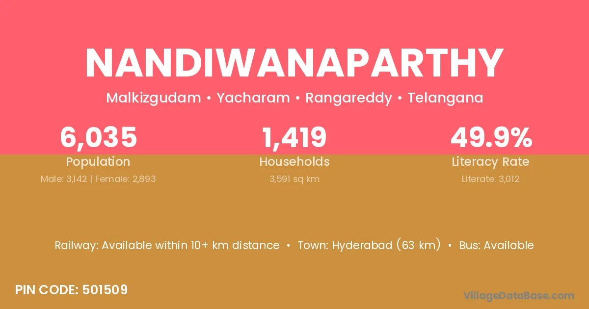 Hyderabad (63 km) is the nearest town to Nandiwanaparthy village for major economic activities and is located approximately 63 km away.