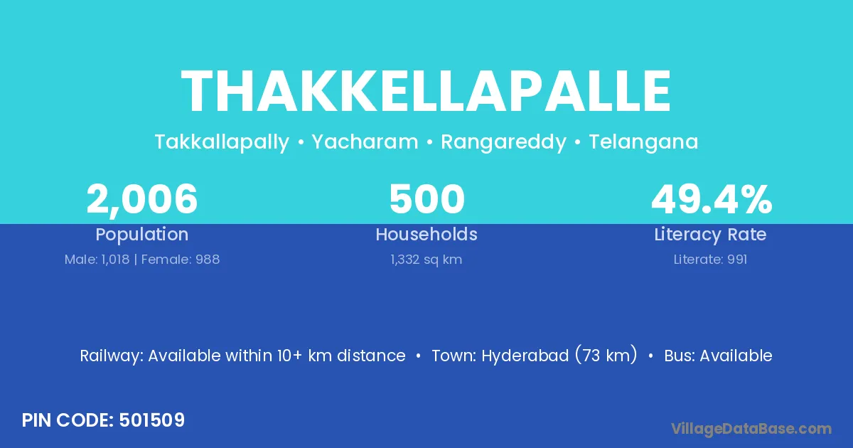 Hyderabad (73 km) is the nearest town to Thakkellapalle village for major economic activities and is located approximately 73 km away.