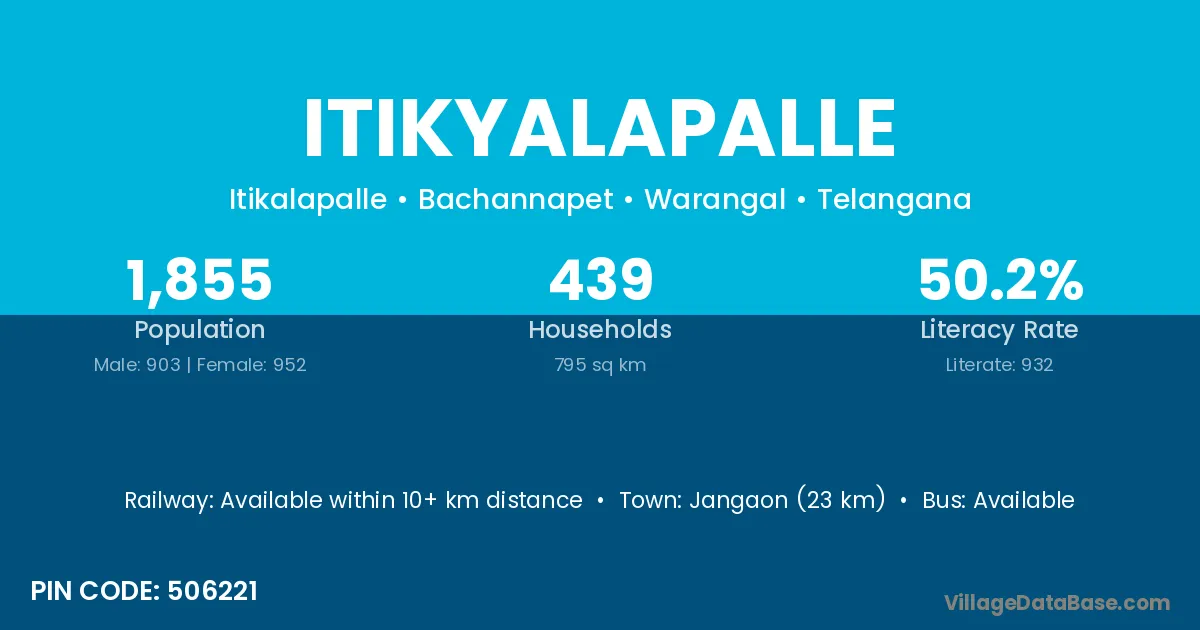 Jangaon (23 km) is the nearest town to Itikyalapalle village for major economic activities and is located approximately 23 km away.