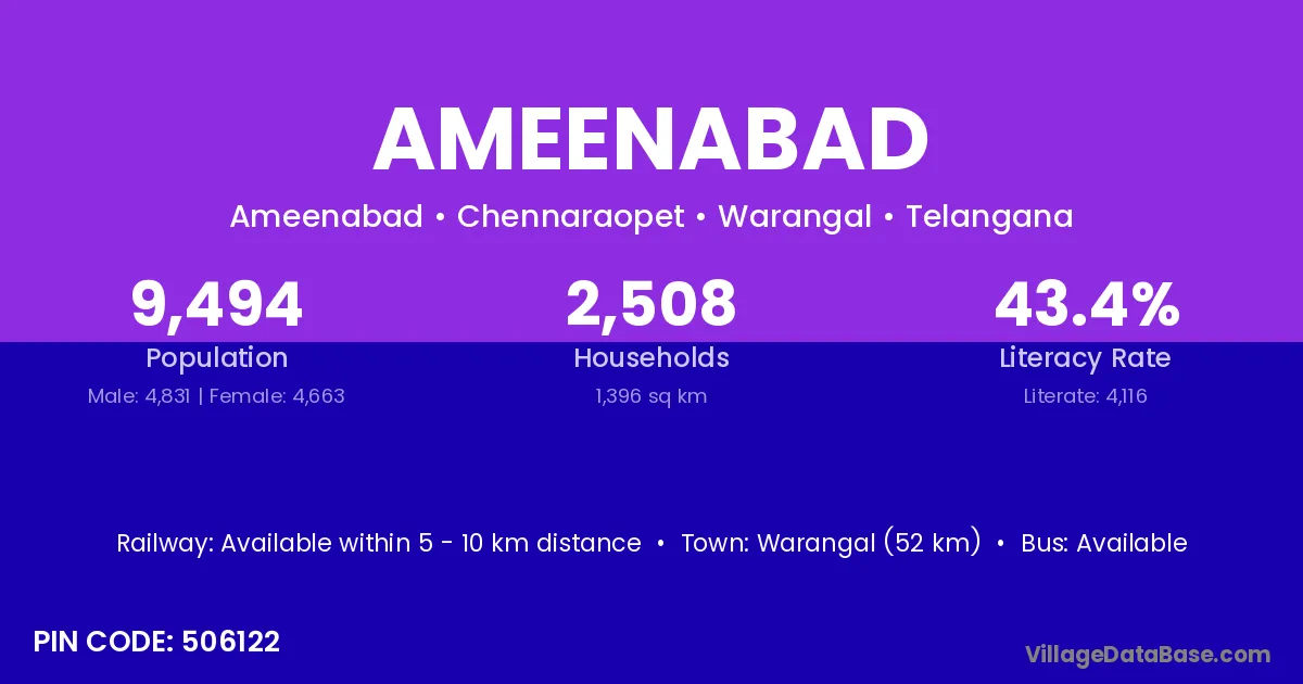 Warangal (52 km) is the nearest town to Ameenabad village for major economic activities and is located approximately 52 km away.
