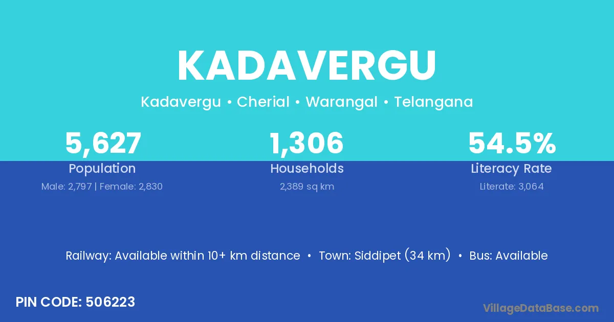Siddipet (34 km) is the nearest town to Kadavergu village for major economic activities and is located approximately 34 km away.