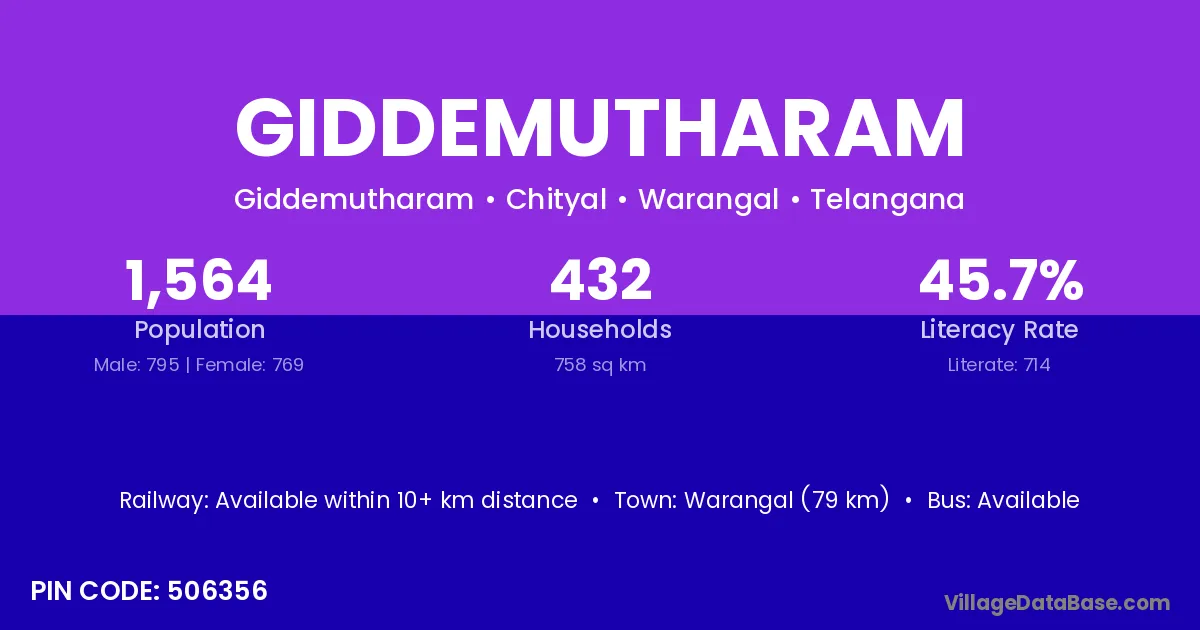 Warangal (79 km) is the nearest town to Giddemutharam village for major economic activities and is located approximately 79 km away.