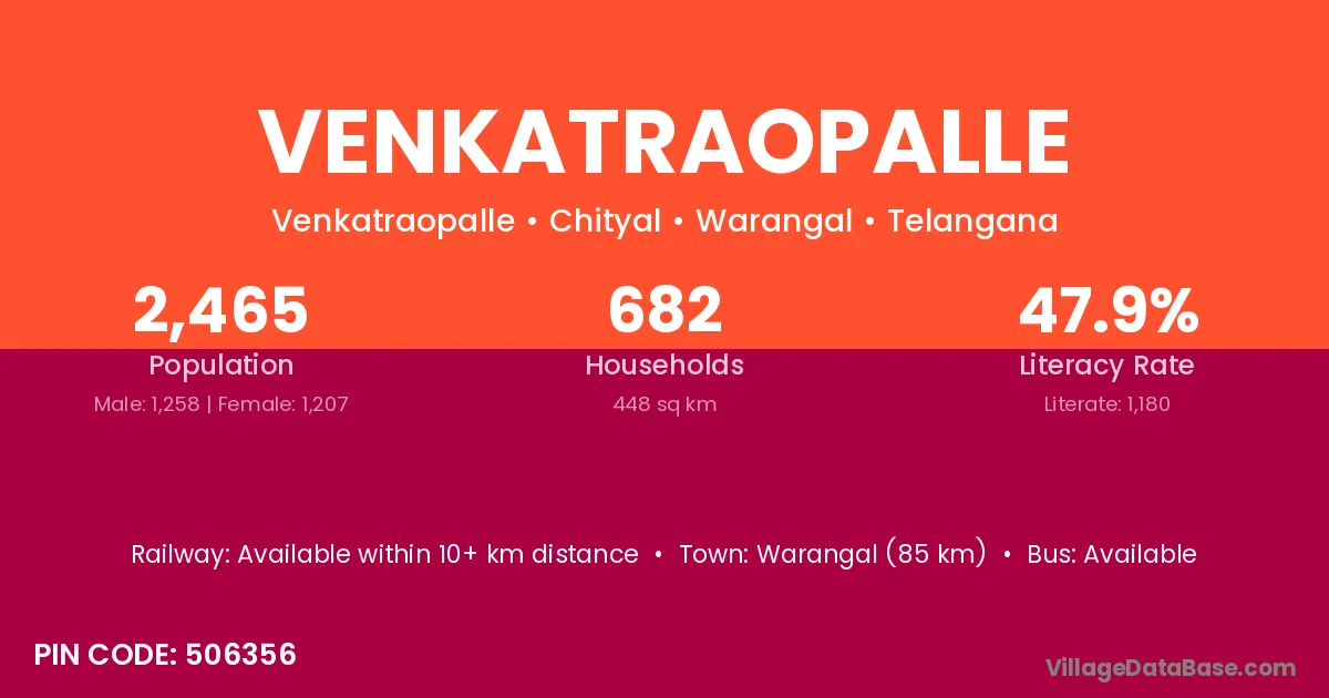 Warangal (85 km) is the nearest town to Venkatraopalle village for major economic activities and is located approximately 85 km away.