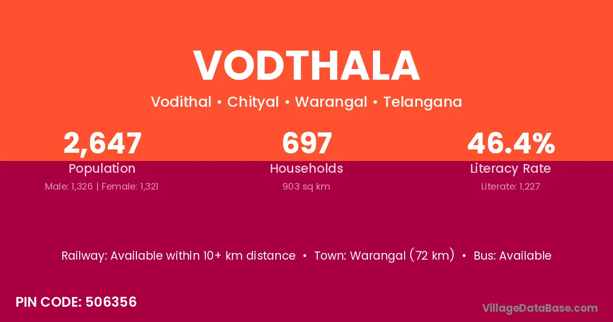 Vodthala village has a total population of 2,647 people, of which 1,326 are males and 1,321 are females.
