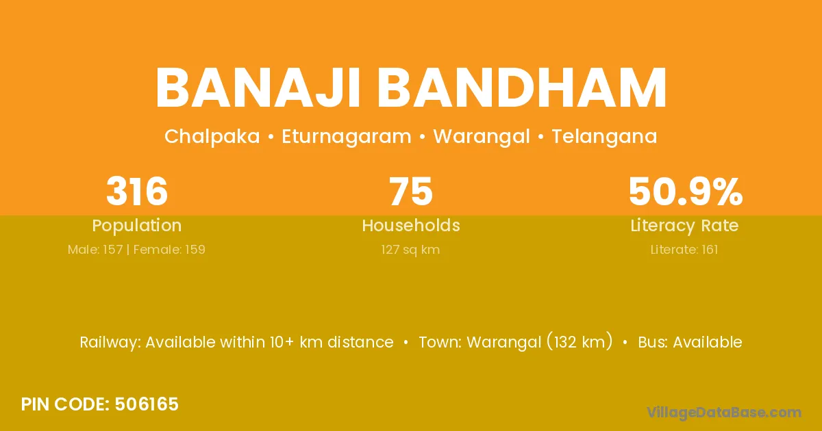 Warangal (132 km) is the nearest town to Banaji Bandham village for major economic activities and is located approximately 132 km away.
