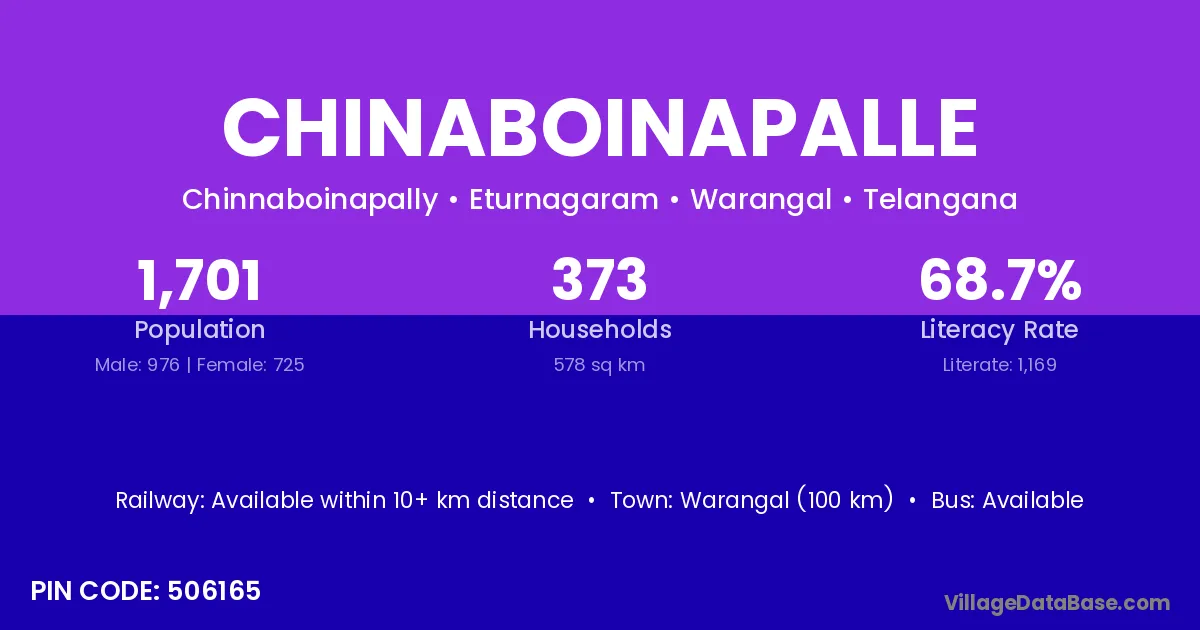 Warangal (100 km) is the nearest town to Chinaboinapalle village for major economic activities and is located approximately 100 km away.