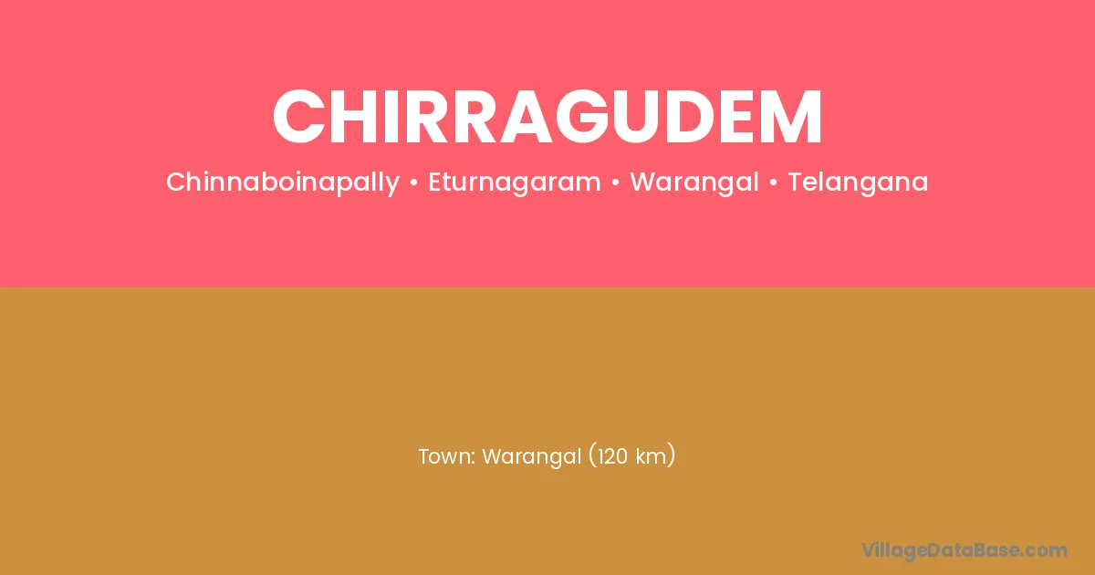 Warangal (120 km) is the nearest town to Chirragudem village for major economic activities and is located approximately 120 km away.