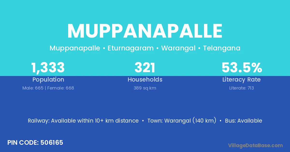 Warangal (140 km) is the nearest town to Muppanapalle village for major economic activities and is located approximately 140 km away.