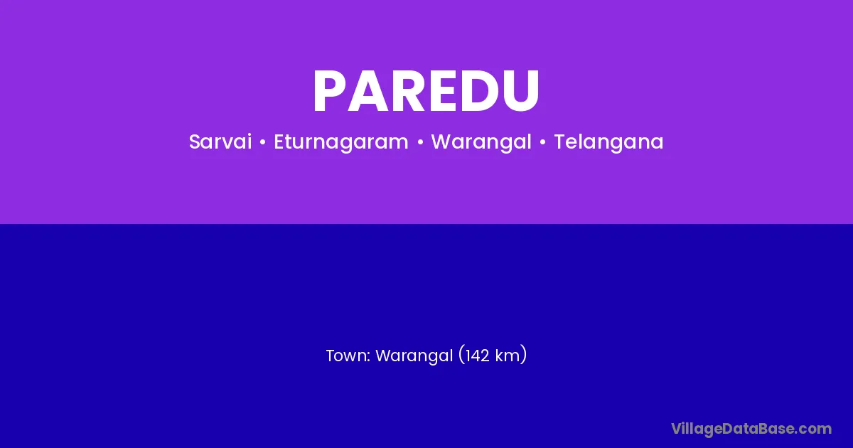 Warangal (142 km) is the nearest town to Paredu village for major economic activities and is located approximately 142 km away.