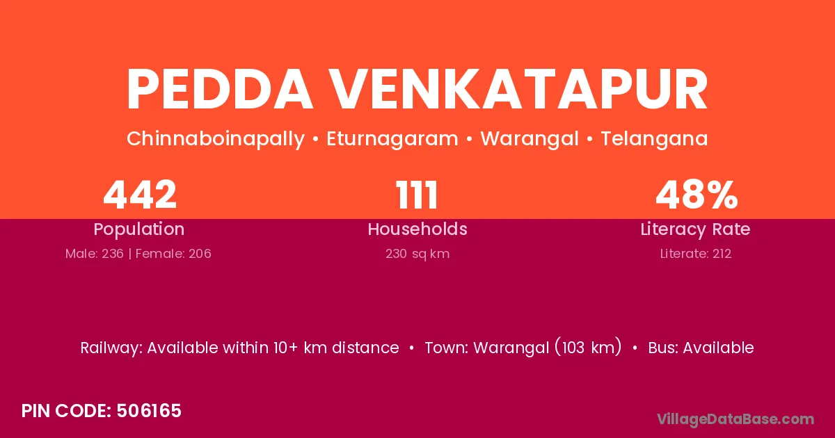 Pedda Venkatapur village has a total population of 442 people, of which 236 are males and 206 are females.