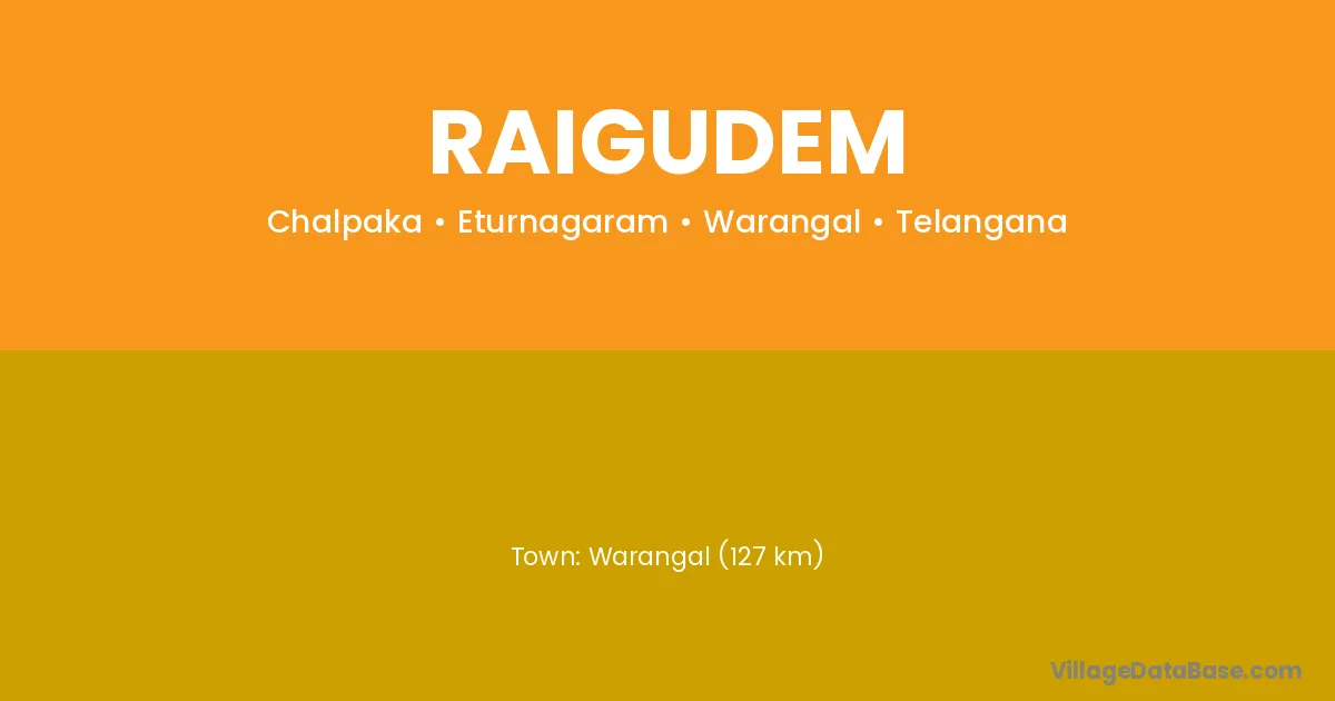 Warangal (127 km) is the nearest town to Raigudem village for major economic activities and is located approximately 127 km away.
