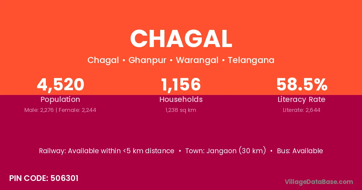 Jangaon (30 km) is the nearest town to Chagal village for major economic activities and is located approximately 30 km away.