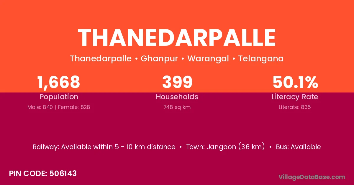 Thanedarpalle village has a total population of 1,668 people, of which 840 are males and 828 are females.