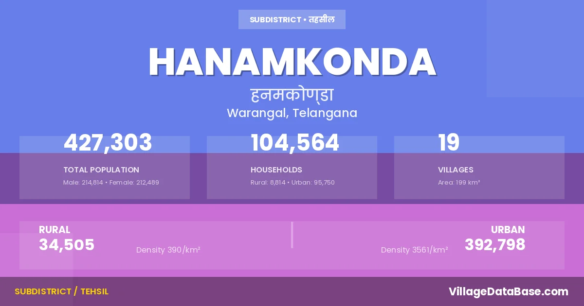 According to the 2011 census The total area of Hanamkonda Mandal is 199 km², with a population of 427303 people. The population density is 2,149 inhabitants per square kilometre, and there are approximately 104564 houses in the sub district.