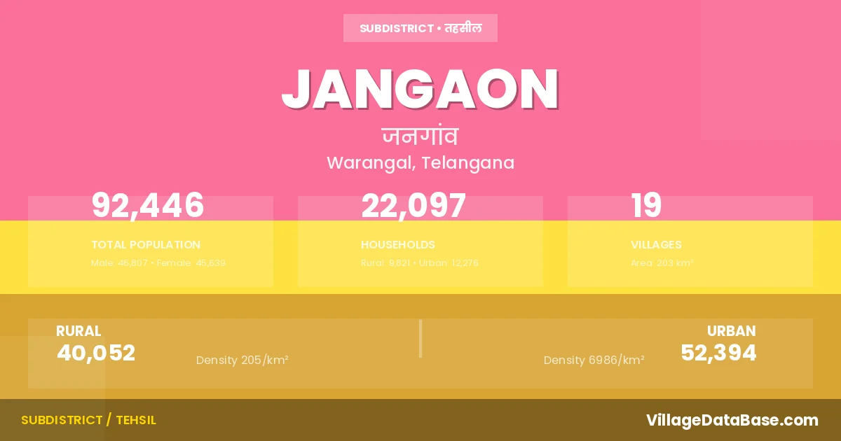 According to the 2011 census The total area of Jangaon Mandal is 203 km², with a population of 92446 people. The population density is 455 inhabitants per square kilometre, and there are approximately 22097 houses in the sub district.