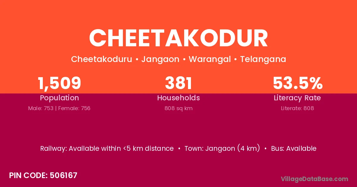 Jangaon (4 km) is the nearest town to Cheetakodur village for major economic activities and is located approximately 4 km away.