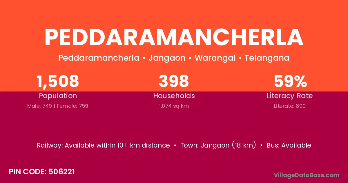 Jangaon (18 km) is the nearest town to Peddaramancherla village for major economic activities and is located approximately 18 km away.