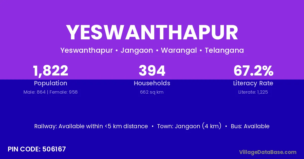 Jangaon (4 km) is the nearest town to Yeswanthapur village for major economic activities and is located approximately 4 km away.