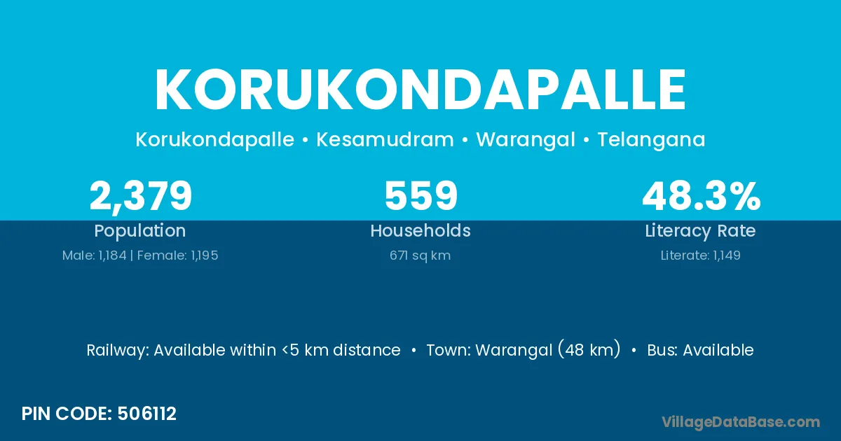 Warangal (48 km) is the nearest town to Korukondapalle village for major economic activities and is located approximately 48 km away.