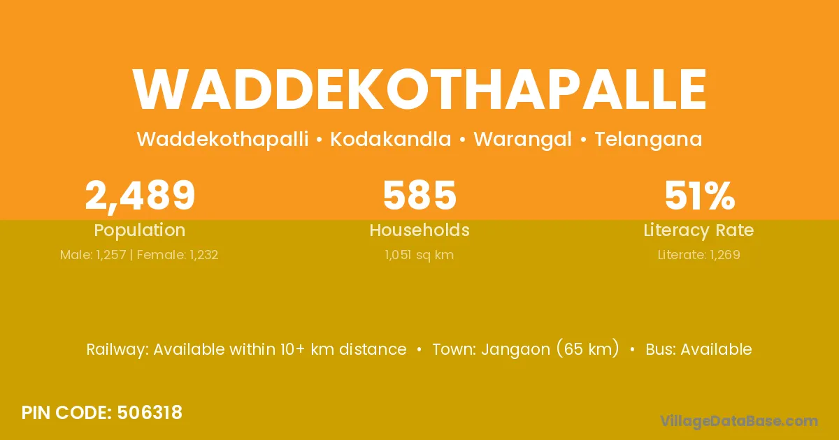 Jangaon (65 km) is the nearest town to Waddekothapalle village for major economic activities and is located approximately 65 km away.