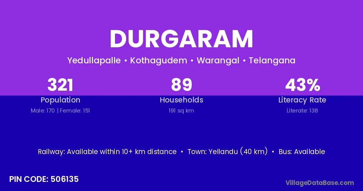 Yellandu (40 km) is the nearest town to Durgaram village for major economic activities and is located approximately 40 km away.