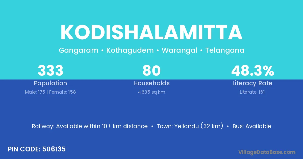 Yellandu (32 km) is the nearest town to Kodishalamitta village for major economic activities and is located approximately 32 km away.