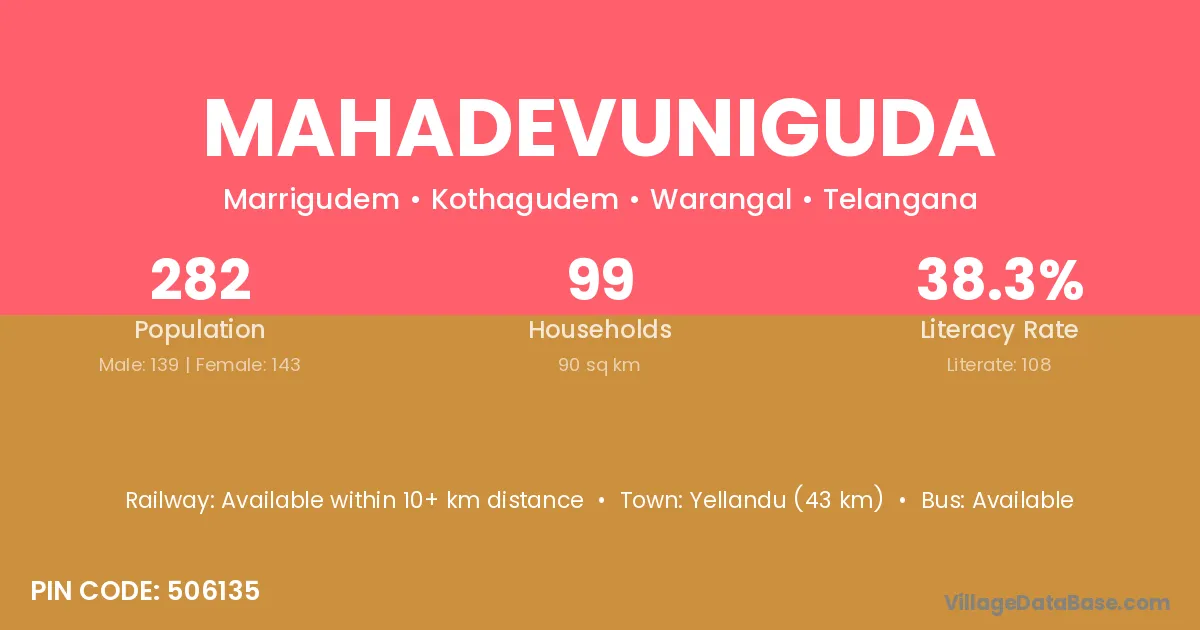 Yellandu (43 km) is the nearest town to Mahadevuniguda village for major economic activities and is located approximately 43 km away.