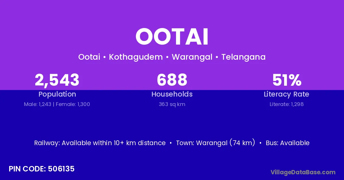 Warangal (74 km) is the nearest town to Ootai village for major economic activities and is located approximately 74 km away.