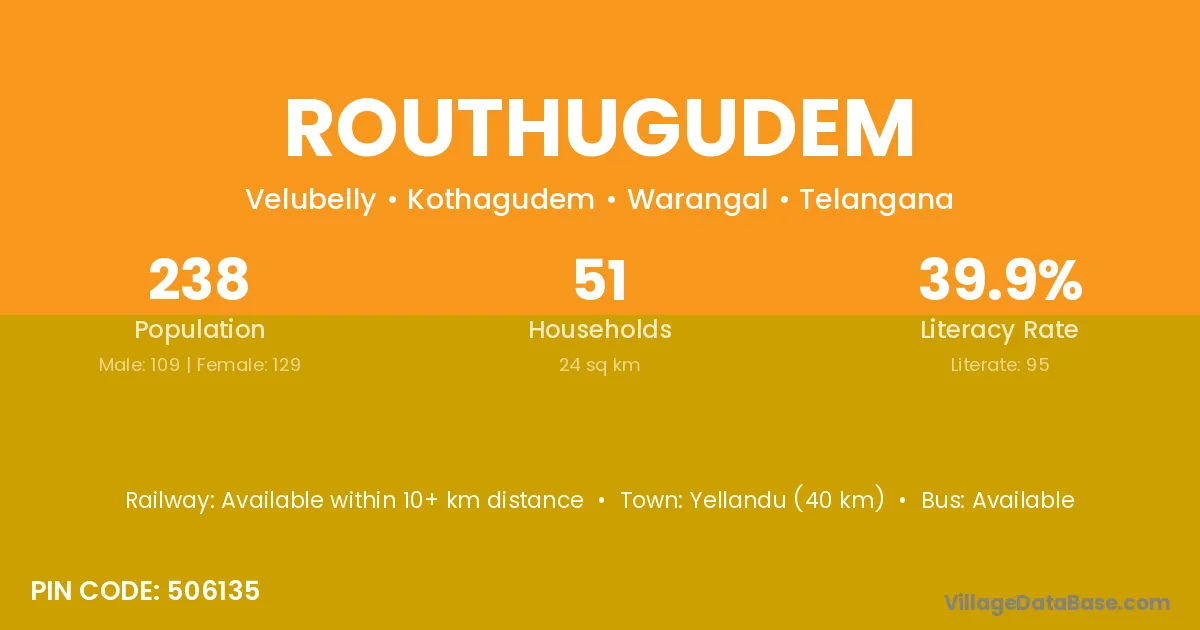 Yellandu (40 km) is the nearest town to Routhugudem village for major economic activities and is located approximately 40 km away.