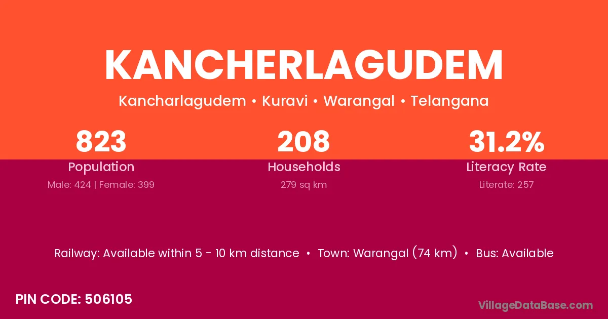 Warangal (74 km) is the nearest town to Kancherlagudem village for major economic activities and is located approximately 74 km away.