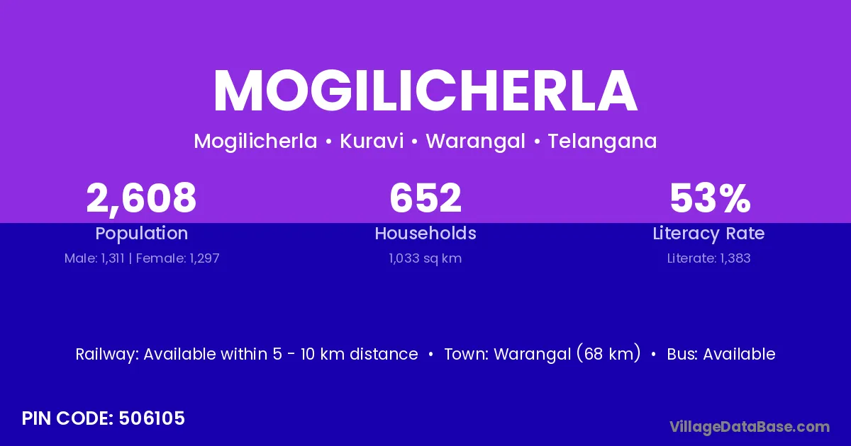 Warangal (68 km) is the nearest town to Mogilicherla village for major economic activities and is located approximately 68 km away.