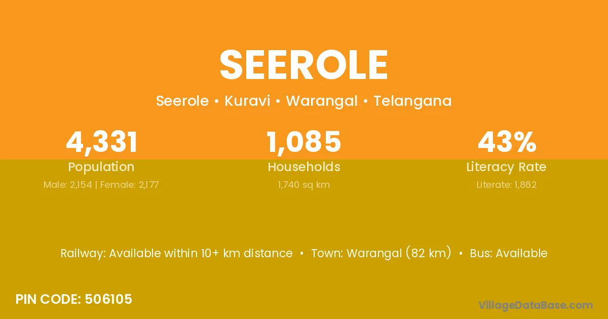 Warangal (82 km) is the nearest town to Seerole village for major economic activities and is located approximately 82 km away.