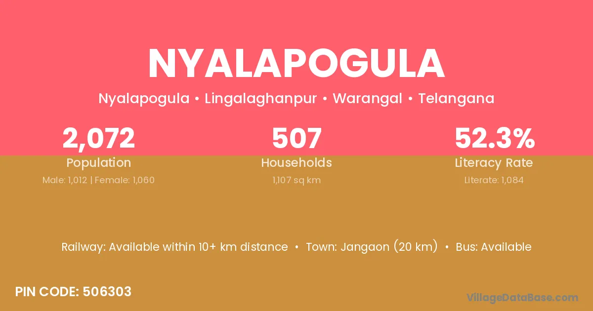 Jangaon (20 km) is the nearest town to Nyalapogula village for major economic activities and is located approximately 20 km away.