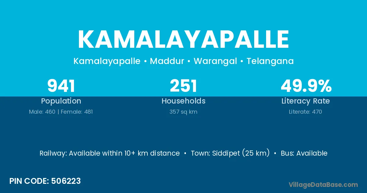 Siddipet (25 km) is the nearest town to Kamalayapalle village for major economic activities and is located approximately 25 km away.