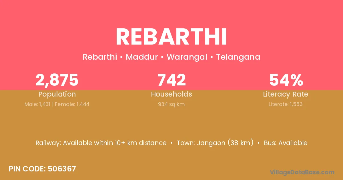 Jangaon (38 km) is the nearest town to Rebarthi village for major economic activities and is located approximately 38 km away.