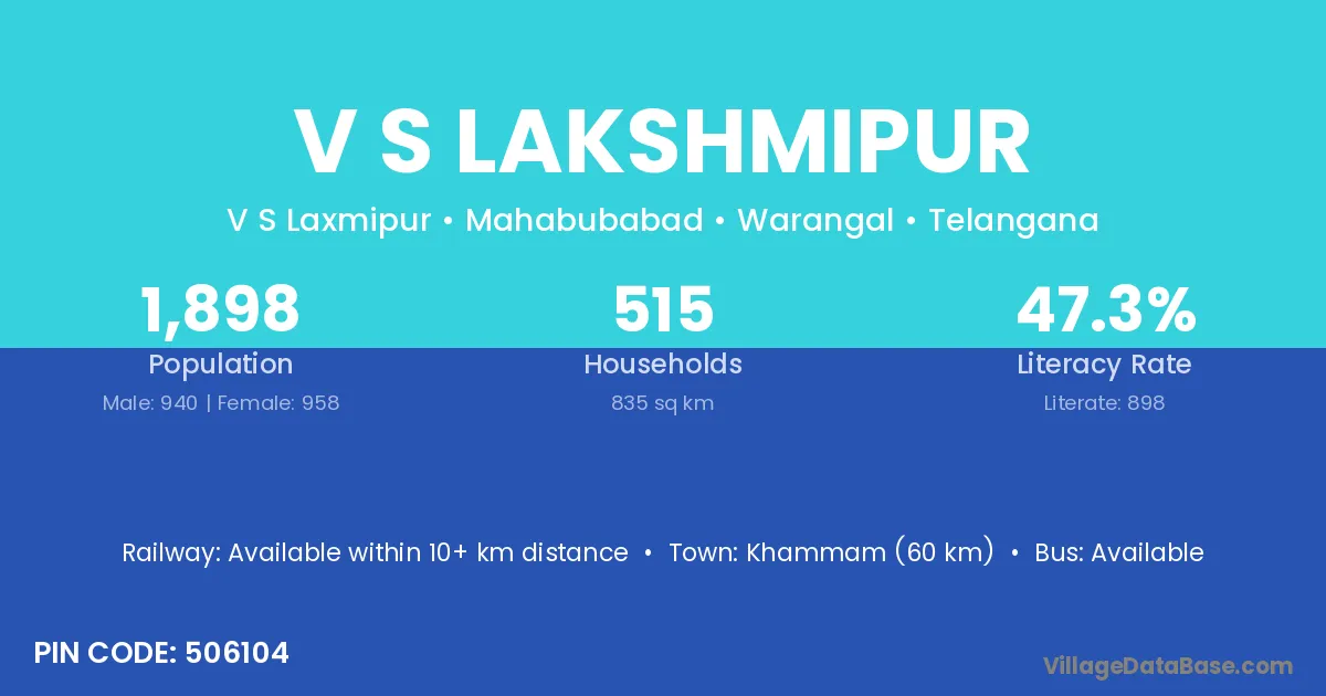 Khammam (60 km) is the nearest town to V S Lakshmipur village for major economic activities and is located approximately 60 km away.