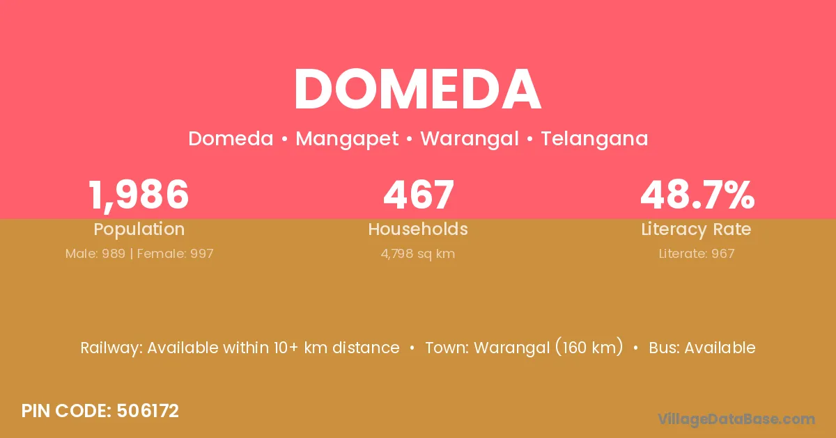 Warangal (160 km) is the nearest town to Domeda village for major economic activities and is located approximately 160 km away.