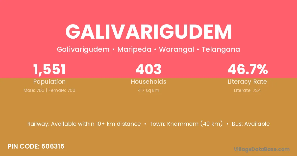 Galivarigudem village has a total population of 1,551 people, of which 783 are males and 768 are females.