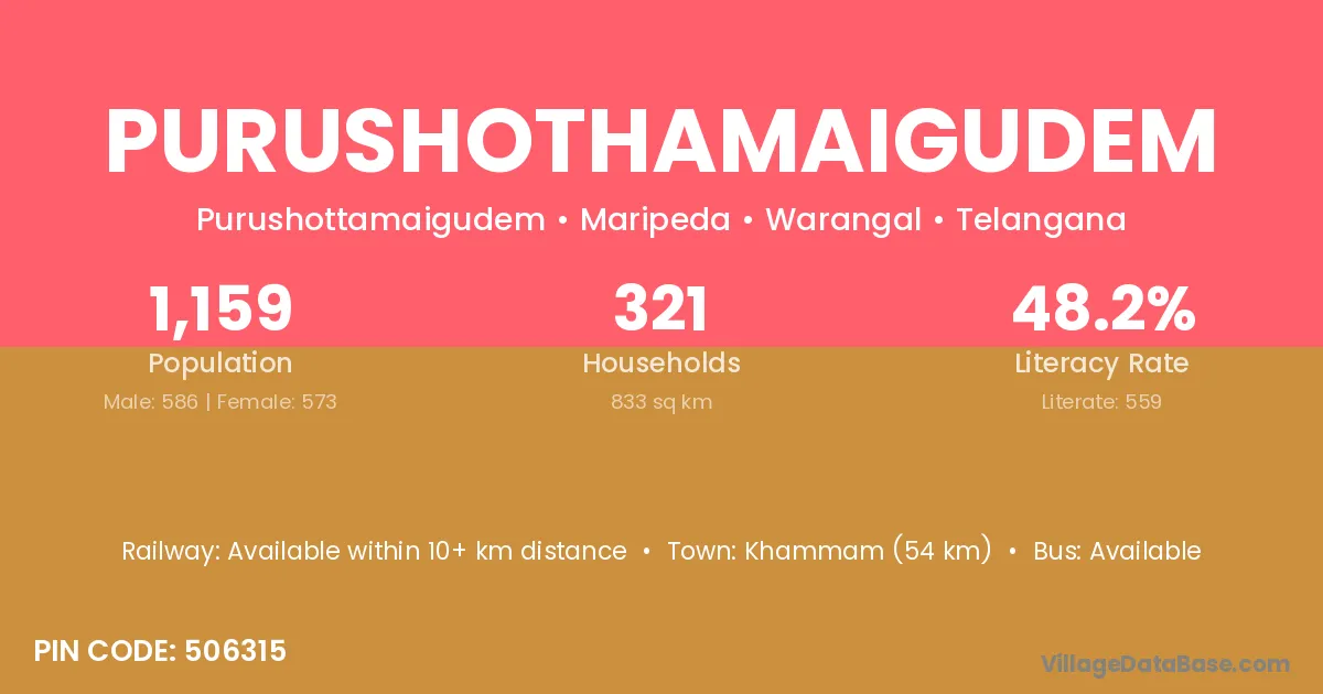 Khammam (54 km) is the nearest town to Purushothamaigudem village for major economic activities and is located approximately 54 km away.