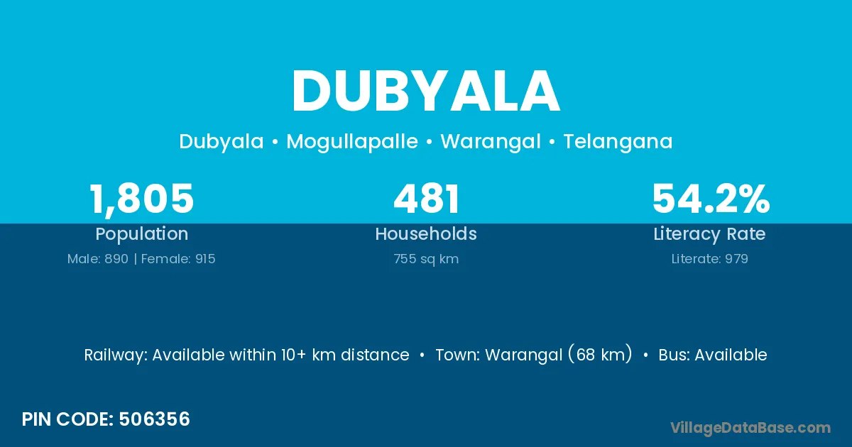 According to Census 2011 information, the village code of Dubyala village is 506356.
