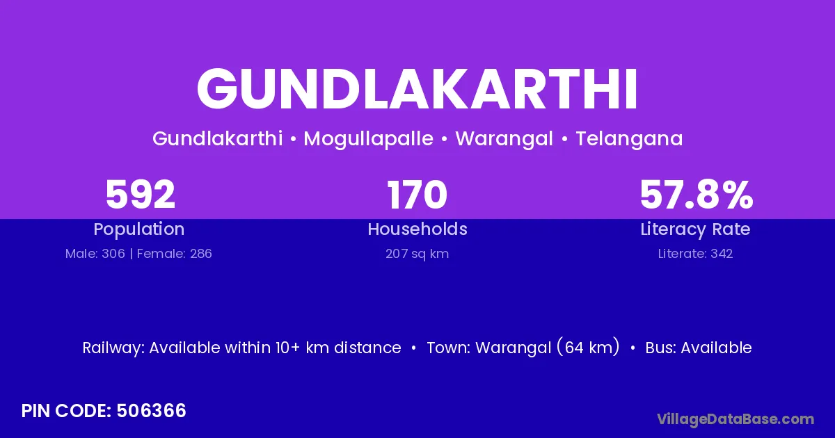 Warangal (64 km) is the nearest town to Gundlakarthi village for major economic activities and is located approximately 64 km away.